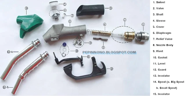 5 & 6 itu sensor otomatis, pernah perhatikan nozzle yang lagi ngisi bensin ke tanki mobil tetapi dilepaskan sama petugasnya? Pas nyaris penuh tuh nozzle bunyi 'jeglek' sendiri. itu karena sensor ini mendeteksi fluida telah mencapai mulut nozzle (2a & 2b) dan aliran fluida automatis di-stop, yang berarti bensin sudah hampir full tank. Maka dari itu lalu petugasnya megangin lagi tuh nozzle sambil selalu ngisi pelan-pelan sampai betul-betul penuh (full tank).